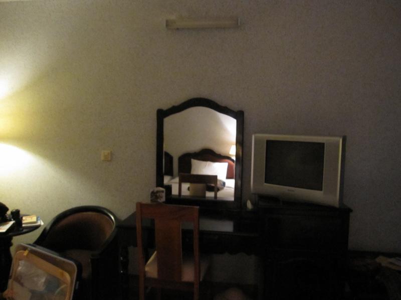 ベッドの正面には机、椅子、鏡、テレビがあります。