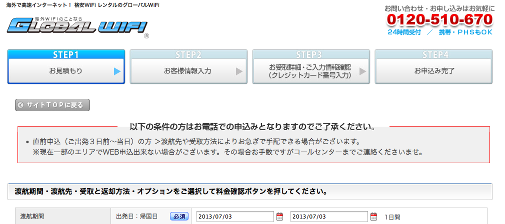 それでは、「Global Wifi」お申し込みの手順を説明します。