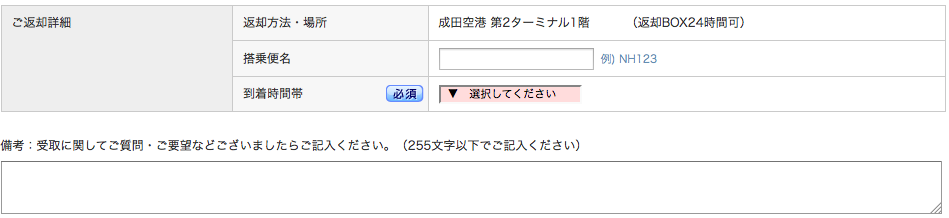 管理人は「受け取り:国内宅配(自宅)」「返却:成田空港」