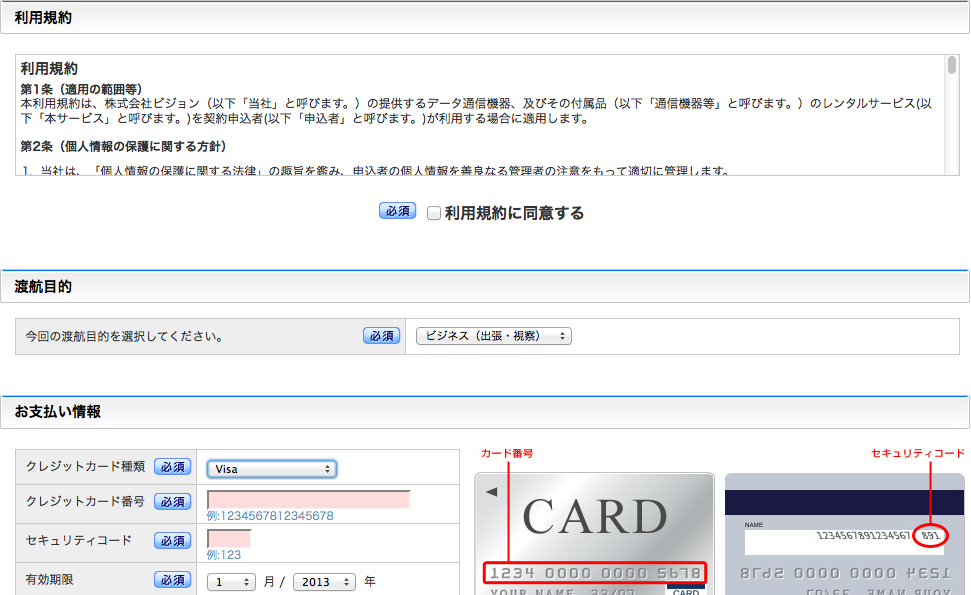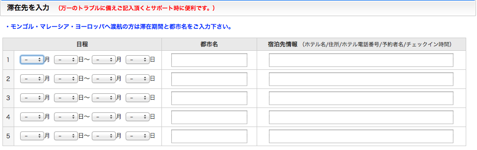 また、同ページの下部にて渡航目的やクレジットカード番号など